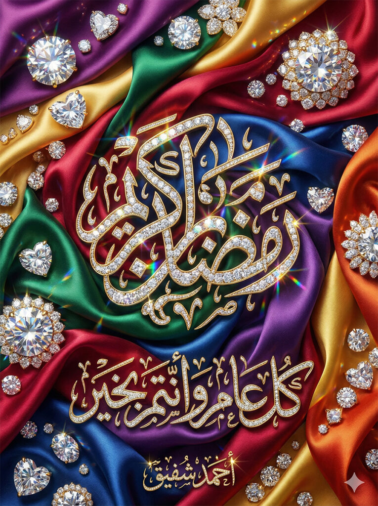 "description": "A luxurious, jewel-toned Ramadan greeting in a 3:4 aspect ratio, photographed in a close-up, top-down view. The background features opulent, swirling ribbons of jewel-toned silk in ruby red, emerald green, sapphire blue, amethyst purple, golden yellow, and orange, with a soft, satin finish. Embedded within and scattered across these swirling ribbons are numerous sparkling, multifaceted diamonds and diamond-encrusted elements, resembling a scattering of precious gems. At the center, replacing the large heart, is an elaborate, large, diamond-encrusted Arabic calligraphy for 'رمضان كريم' (Ramadan Kareem). The letters are formed from pavé-set white diamonds with gold filigree edges, refracting light in rainbow colors. Below it, in elegant, flowing Arabic script also encrusted with smaller diamonds and gold, is the phrase 'كل عام و أنتم بخير' (Kullu 'am wa antum bi-khair). At the bottom, in a smaller, stylized golden diamond script, is the signature 'أحمد شفيق' (Ahmed Shafiq). The overall impression is one of extreme luxury, sparkle, and vibrant celebration.",
