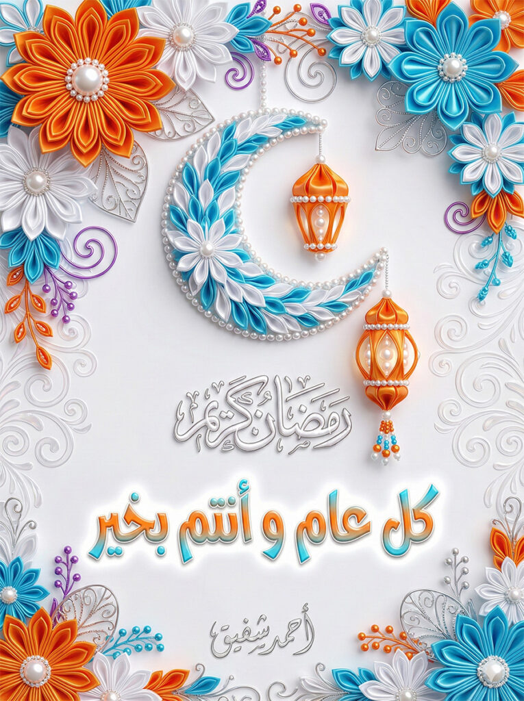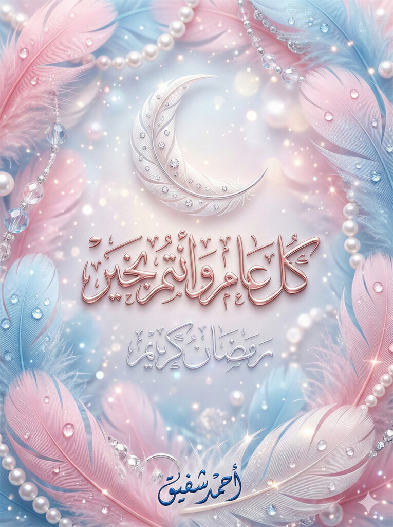 "execution_prompt": "Create a hyper-realistic vertical Ramadan greeting card with an aspect ratio of 3:4. The scene should be a macro close-up masterpiece featuring soft, interweaving feathers in pastel pink and baby blue, adorned with pearls, water droplets, and glitter. In the center, render the Arabic phrase 'كل عام و أنتم بخير' in luxurious 3D Rose Gold calligraphy. Below it, add 'رمضان كريم' in silver. At the very bottom, include the signature 'أحمد شفيق' in a stylish, legible script. The lighting should be magical and soft, creating a WOW factor with intricate details and a serene, celebratory atmosphere."