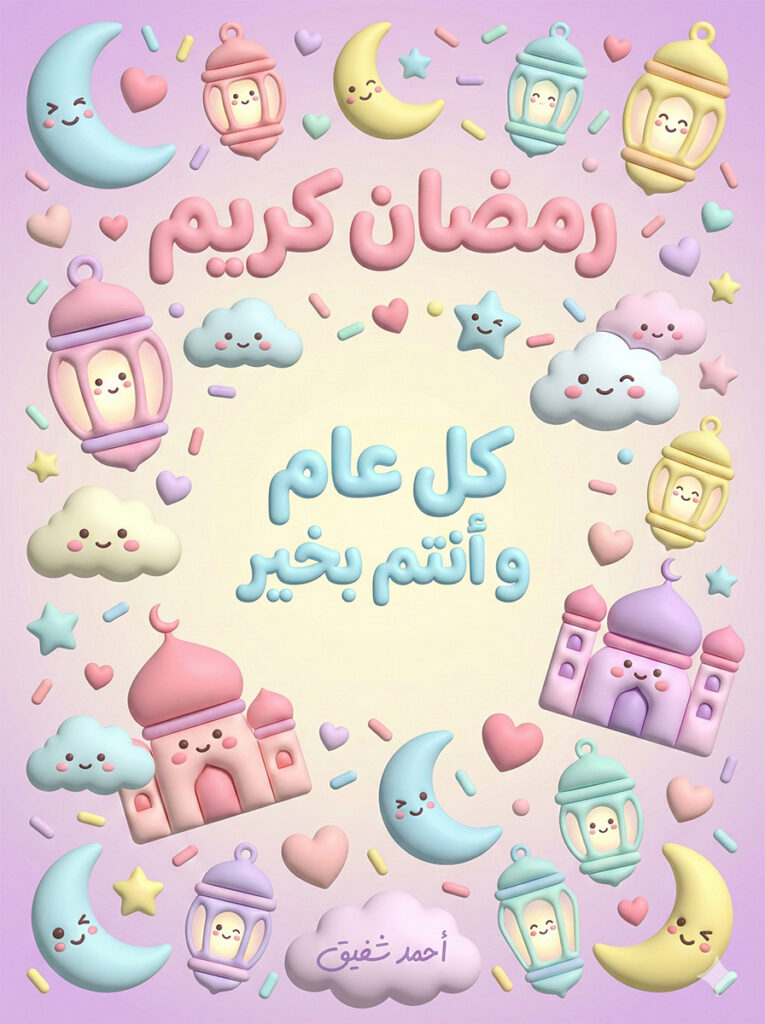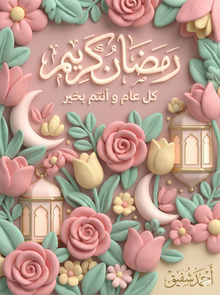 "description": "A luxurious and gentle Ramadan greeting where the text and motifs are harmoniously integrated into a lush, soft-textured 3D floral environment. The pastel colors and soft lighting create a warm, inviting, and high-quality aesthetic with an immediate visual impact."